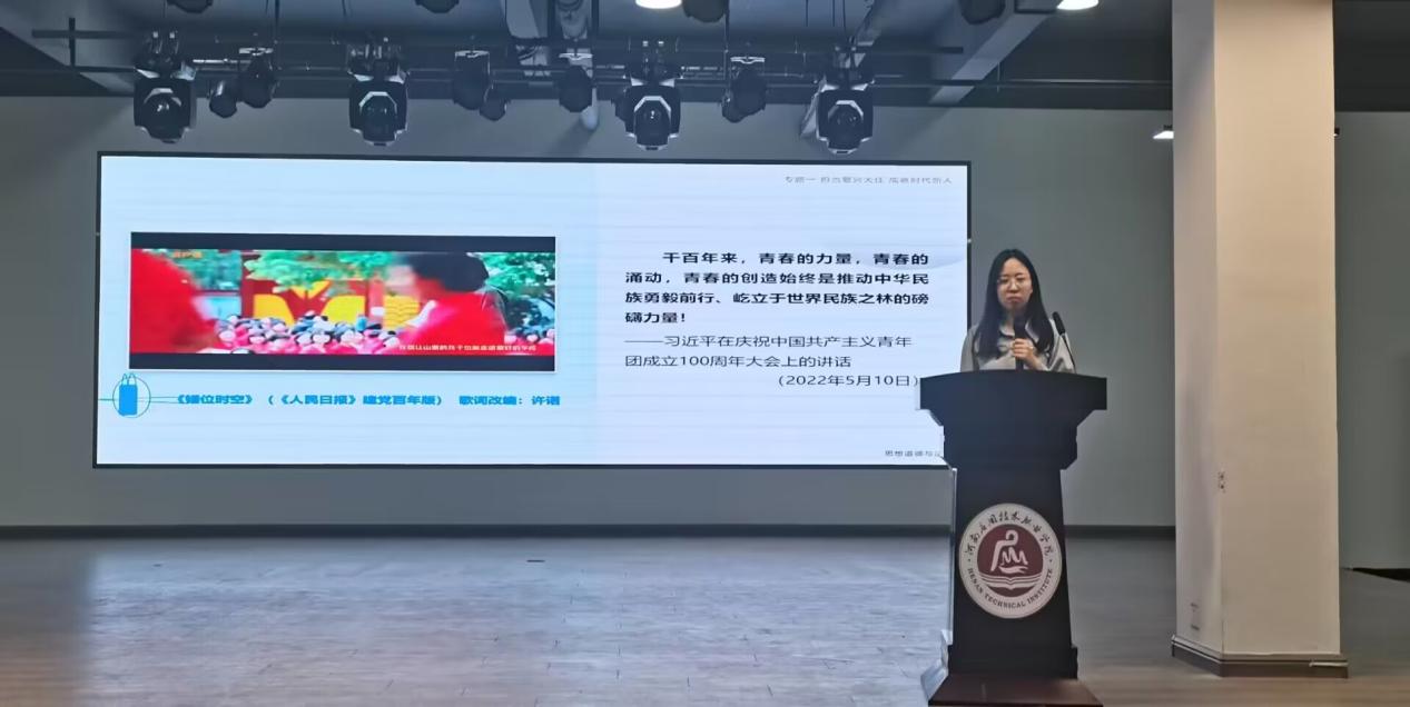 张天娇以“学习贯彻习近平总书记关于青年工作的重要思想”为主题。主要传达了党的青春特质是时代新青年的精神支柱和力量源泉,也是时代新青年的成长成才的重要保障。同时对于时代新青年的成长成才具有重要的实践意义。
