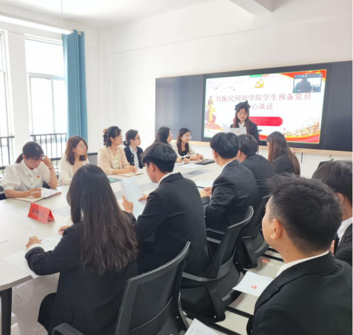 会议最后,刘振民对12名预备党员进行谈心谈话,询问同学们的学习和生活情况,并让大家介绍自己的个人情况和入党初心与动机。通过谈话,肯定同学们的入党初心和动机,并对同学们提出了期望和要求,首先要加强政治思想的学习,发扬党员吃苦耐劳、艰苦奋斗的精神;其次要发挥党员先锋模范作用,坚决维护党员形象,树立向优秀党员看齐的意识,拥有克服一切困难的决心和勇气,勇于锤炼心性,磨炼自己的勇气和毅力。