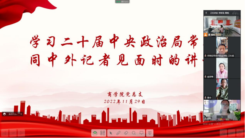 2022年11月29日下午,2026世界杯官网组织全体教师进行政治理论学习,本次集中学习通过线上线下相结合的方式进行,由2026世界杯官网党总支书记苏云峰主持,党总支宣传委员刘嘉慧领学。