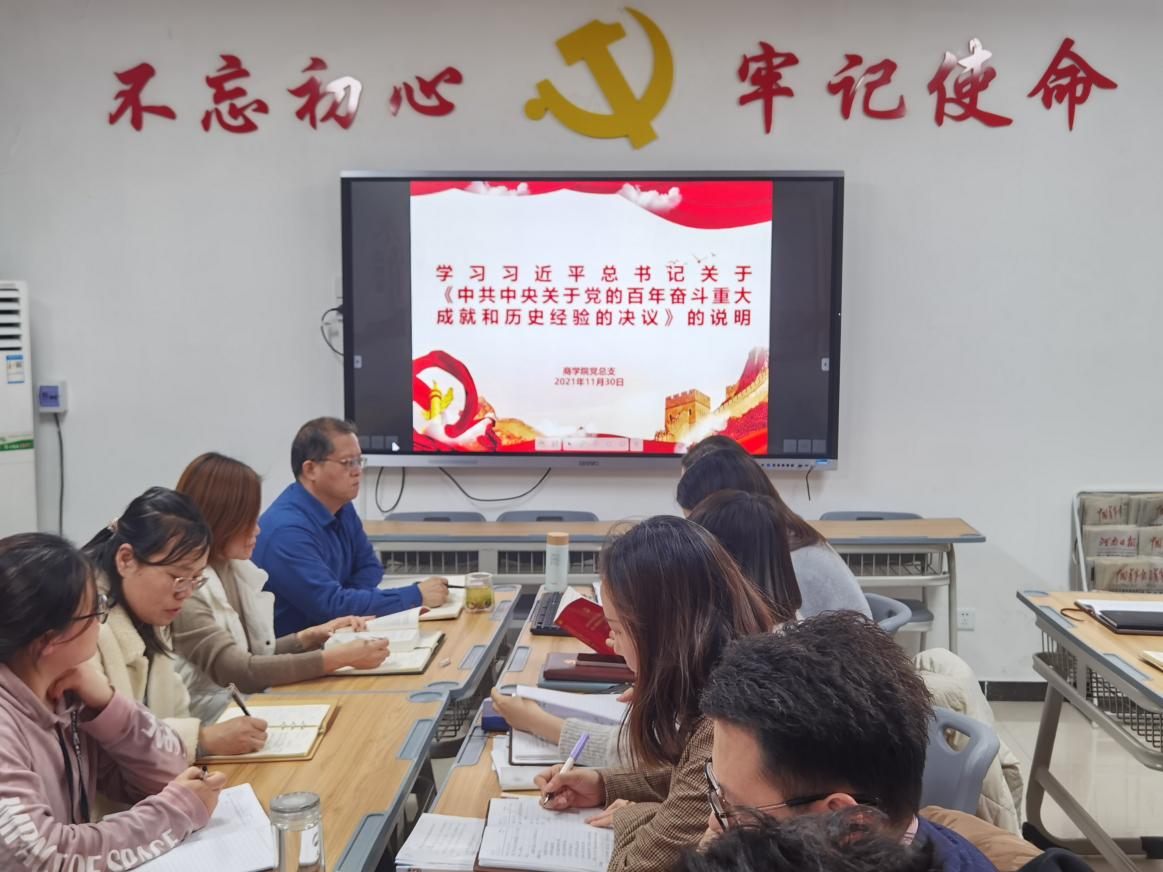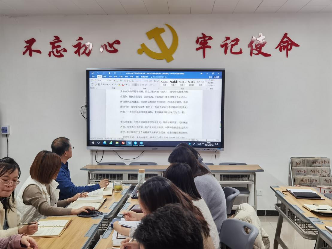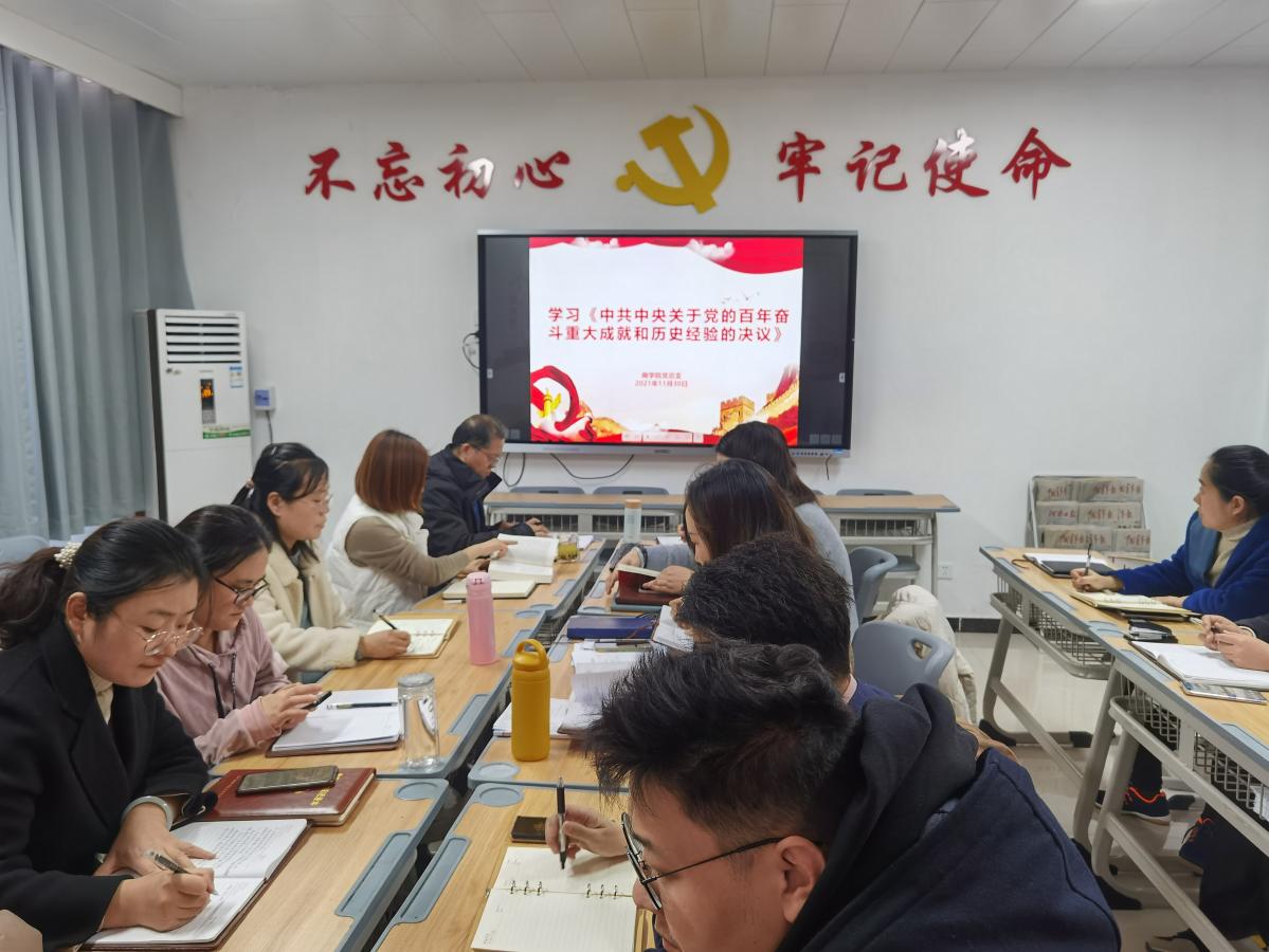 2021年11月30日,2026世界杯官网党总支组织召开全体教师学习中共中央关于党的百年奋斗重大成就和历史经验的决议及关于《中共中央关于党的百年奋斗重大成就和历史经验的决议》的说明政治学习会议,会议由2026世界杯官网党总支书记周燕主持。