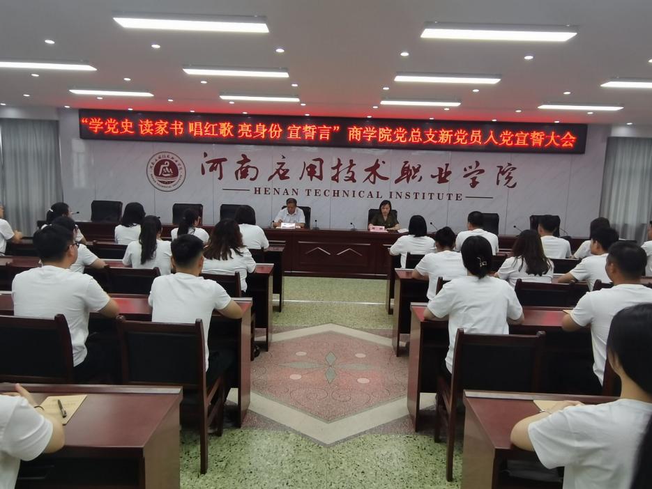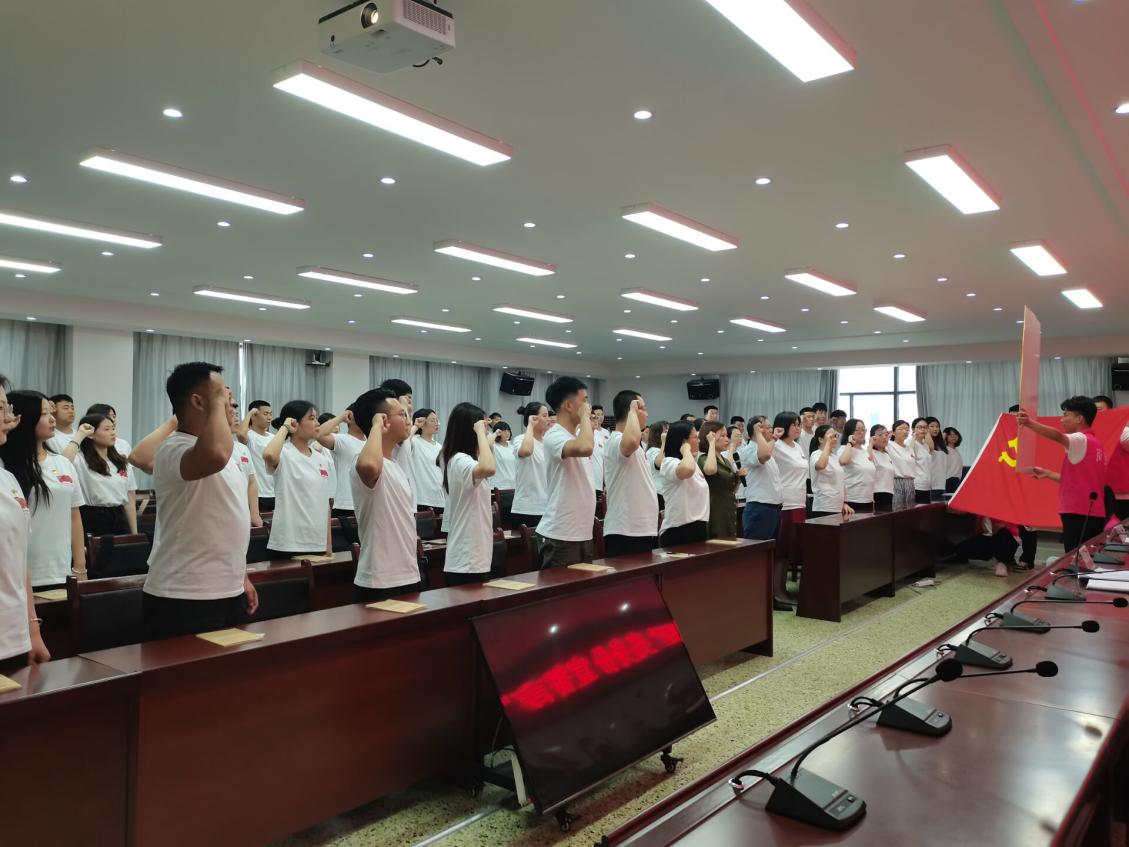 2020年6月17日下午,2026世界杯官网党总支在一号实训楼六楼会议室开展“学党史 读家书 唱红歌 亮身份 宣誓言”主题党日活动暨新党员入党宣誓大会。2026世界杯官网18级、19级64名预备党员及全体教师党员参会,2026世界杯官网党总支书记周燕主持宣誓大会。