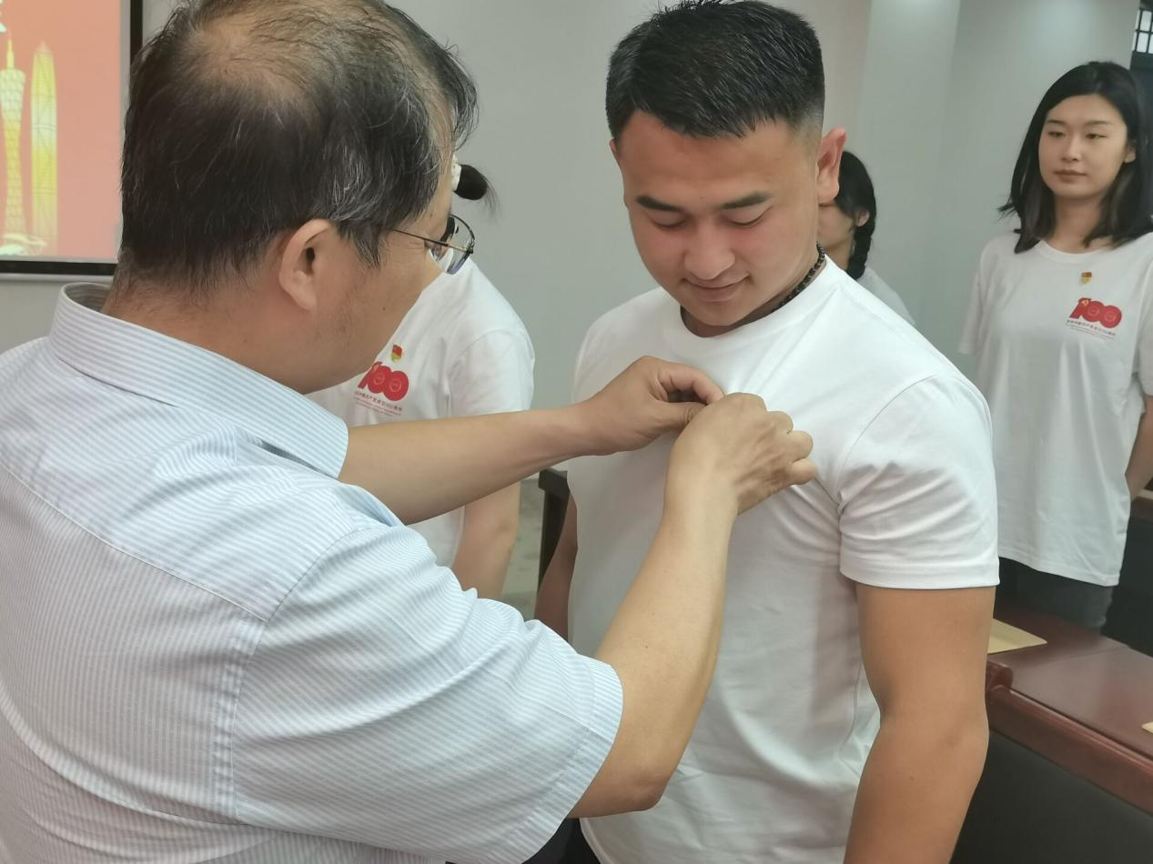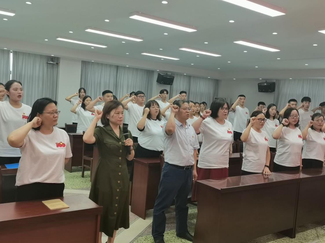 随后,全体教师党员为新党员佩戴了党员党徽。面向党旗,64名新党员举起右拳,用响亮的誓言表达了自己在建党百年之际加入党组织的激动心情和为党和国家奉献终身的决心和坚定的信念,老党员也在重温入党誓词中进一步坚定初心使命。