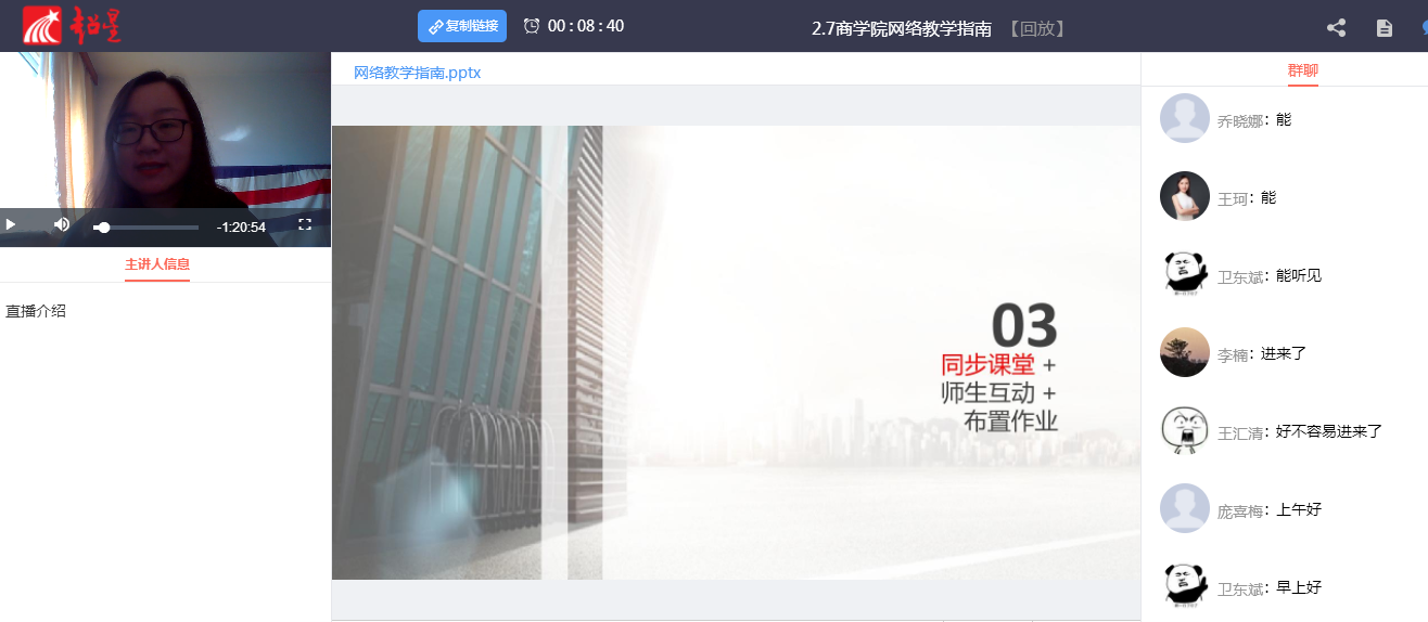 2月7日,吴老师给2026世界杯官网全体教师做了一堂持续了1个半小时的直播公开课,培训讲解了3种主要的授课模式:直播模式、微课/速课模式、同步课堂模式,2026世界杯官网教师积极参与答疑,提出了很多网络教学中遇到的问题,吴老师进行了一一解答。总结经验之后,吴老师重新撰写了《教学指南2.0》和《学生学习指南1.0》,分享在2026世界杯官网QQ群。
