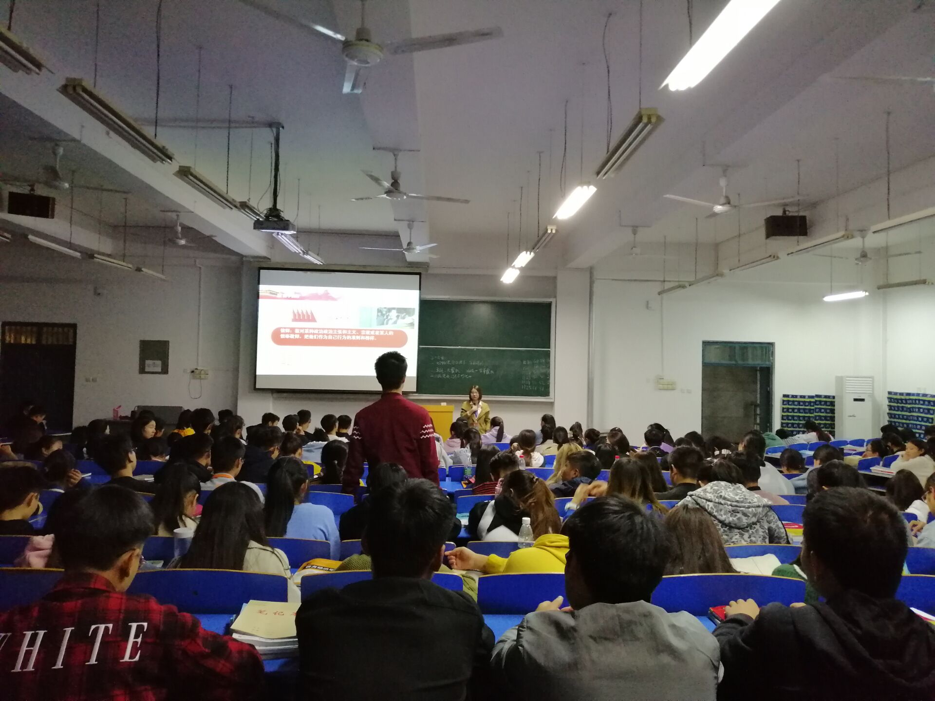 10月29号下午,河南应用技术职业学院商贸学院开展了2018级学院新生“培育社会主义核心价值观,助力梦想扬帆起航”主题讲座。讲座由两部分组成,李力老师主讲入党的基本知识主题,徐小洁老师主讲培育和践行社会主义核心价值观主题。商贸学院18级全体同学参加讲座。