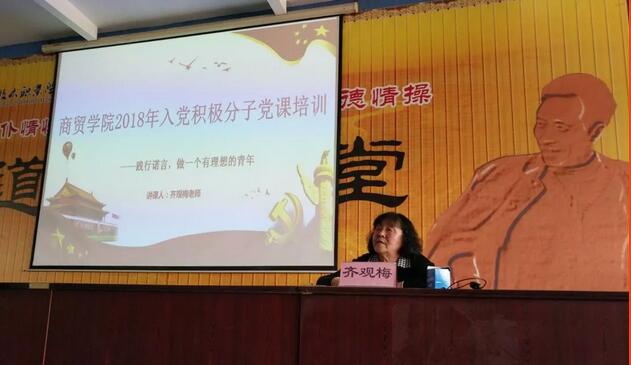 2018年5月23日,2026世界杯齐观梅老师在B楼202为商贸学院教师、学生入党积极分子开展了一次生动的党课教育,商贸学院党总支书记周燕同志主持会议。齐老师以“践行诺言,做一个有理想的青年”为主题,探讨了在新时代要如何继承和弘扬中国共产党精神。
