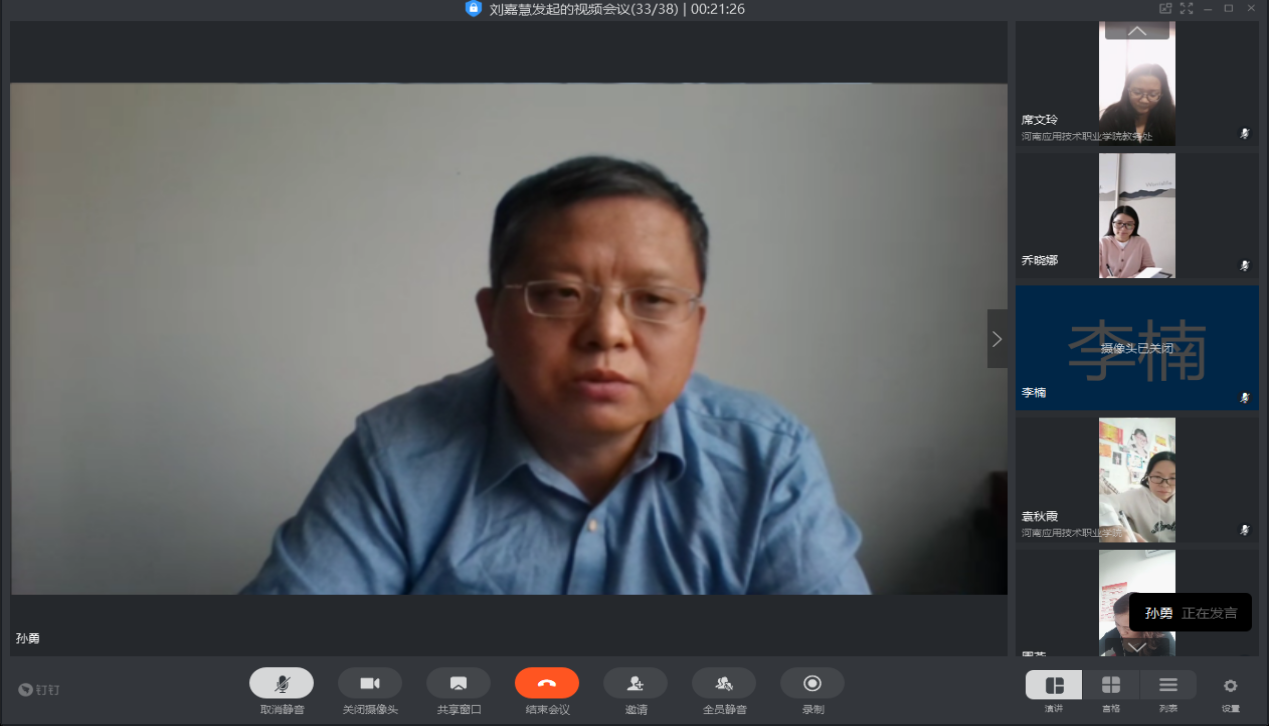 孙勇院长总结:前10周的网络课程运行情况整体比较稳定,通过教务处和学院成立的网课督导小组,对所有教师的网课进行重点教学督导,要求各位老师一定不能松懈,课前准备要充分,授课内容要充分,合理融合理论和实践,加强师生互动,不断完善在线课程资料。同时对下阶段17级毕业生的补考和顶岗实习的重点工作内容及需要注意的事项。孙院长最后强调:双高建设任务将是学院今年的重点工作之一,双高建设要人人参与,共同建设,共享成果。