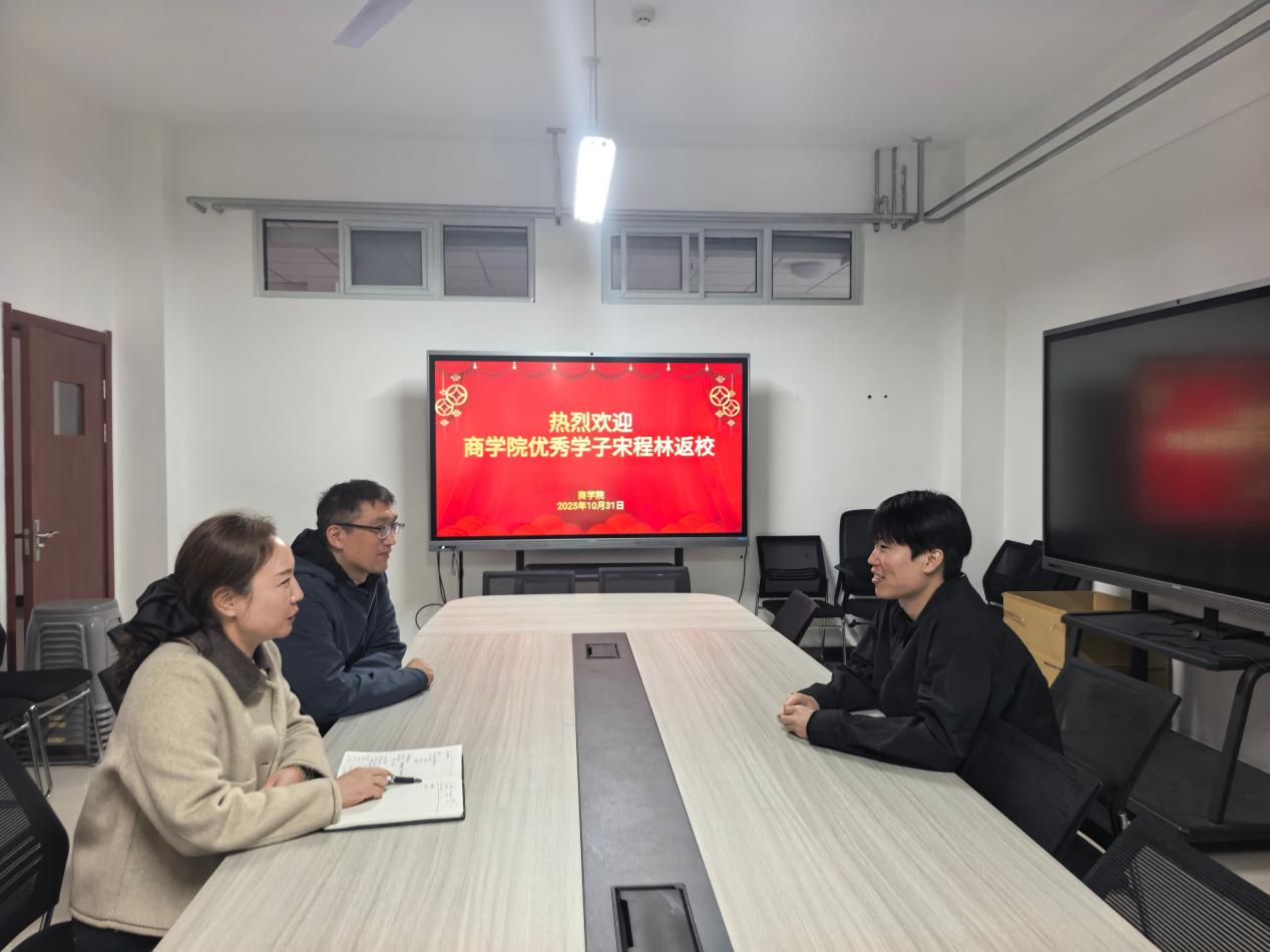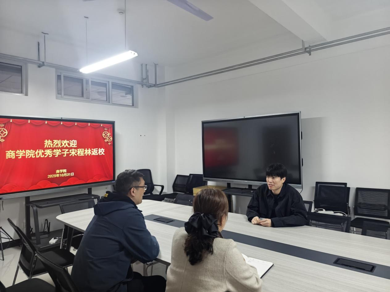 2025年10月31日,2026世界杯官网迎来2017级物流管理专业优秀学子宋程林返校交流。2026世界杯官网党总支书记荆伟科、院长王珂在E211会议室与宋程林深入座谈,围绕其在校学习、专升本深造、职场实践及考研上岸的成长历程展开交流,旨在通过优秀学子榜样力量,深化育人成效,为在校学生树立成长标杆。
