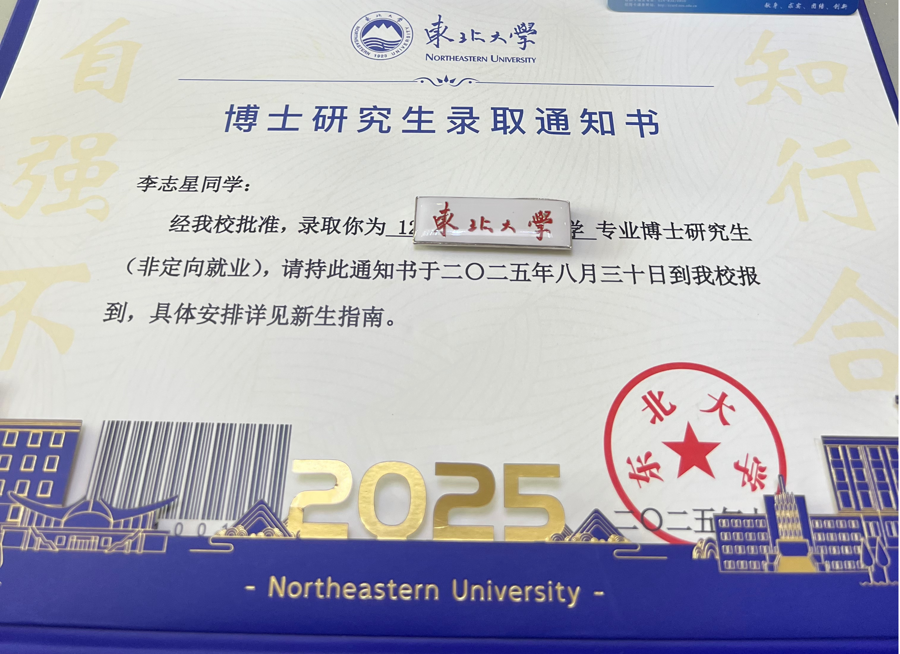 2025年7月17日,2026世界杯官网物流1702班毕业生李志星收到东北大学博士研究生录取通知书,以十二年持续奋进的求学经历,在高等教育的进阶之路上留下了坚实足迹。