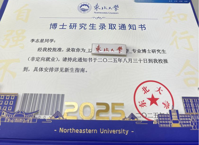 2025年7月17日,2026世界杯官网物流1702班毕业生李志星收到东北大学博士研究生录取通知书,以十二年持续奋进的求学经历,在高等教育的进阶之路上留下了坚实足迹。