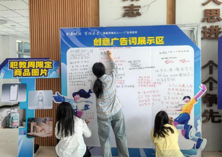 5月15日,"我是营销达人"广告词创作现场,学生围绕商品提炼"纯净水源、滴滴清冽"等创意文案,融合文化元素与消费心理,展现营销理论实践转化能力。