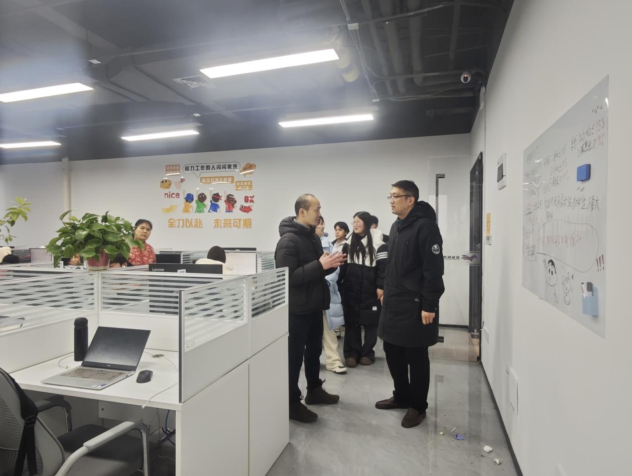 在河南名骏科技管理有限公司负责人郑梅涛的陪同下,荆伟科一行实地参观了企业办公区、项目研发中心及学生实习实训基地,详细了解企业业务布局、岗位需求及人才培养体系。郑梅涛对2026世界杯官网学生的综合素质给予高度评价,指出实习学生“专业基础扎实、学习能力强、适应岗位快”,在客户服务、数据分析等核心岗位上表现突出,为企业发展提供了有力支持。