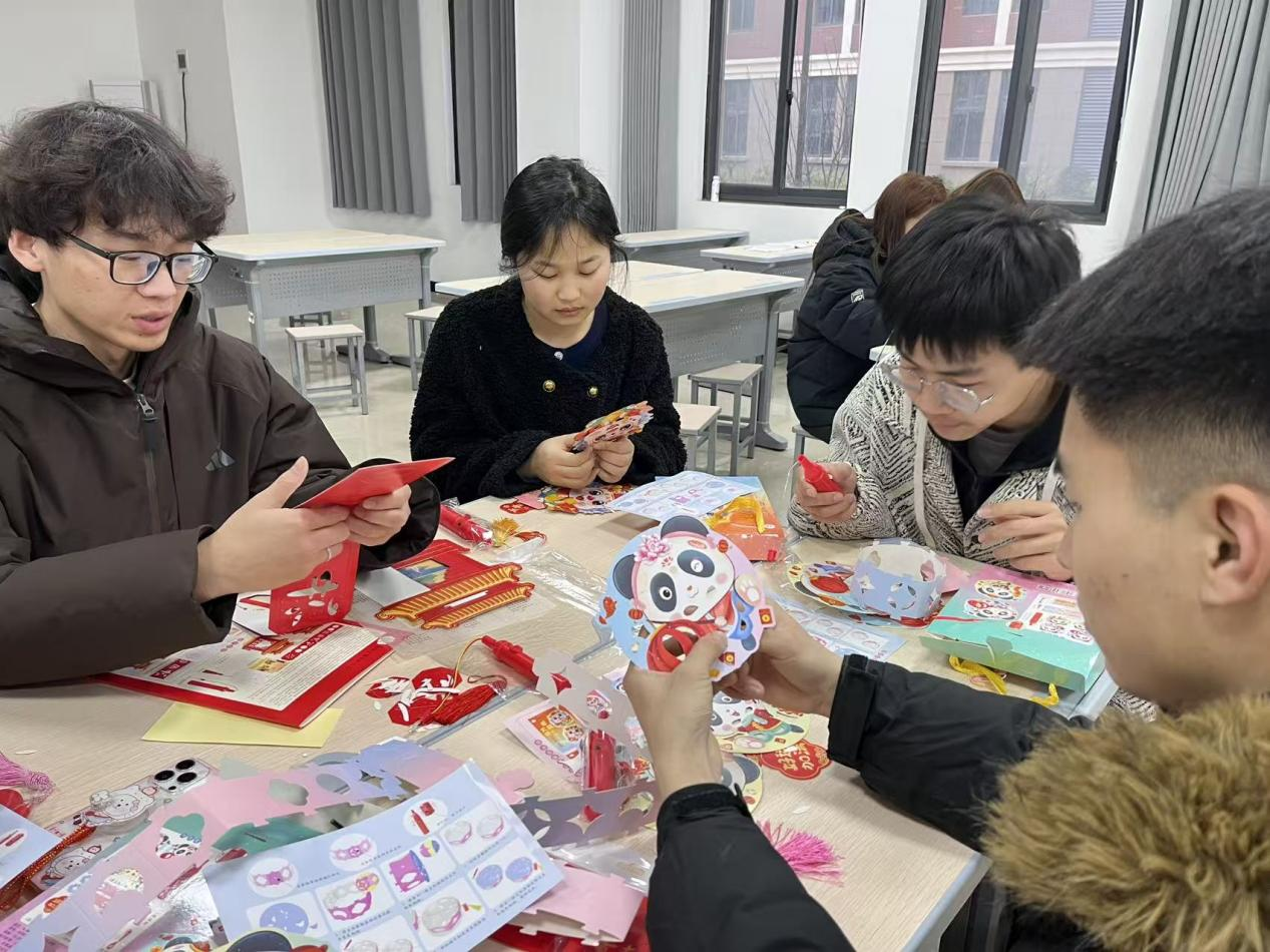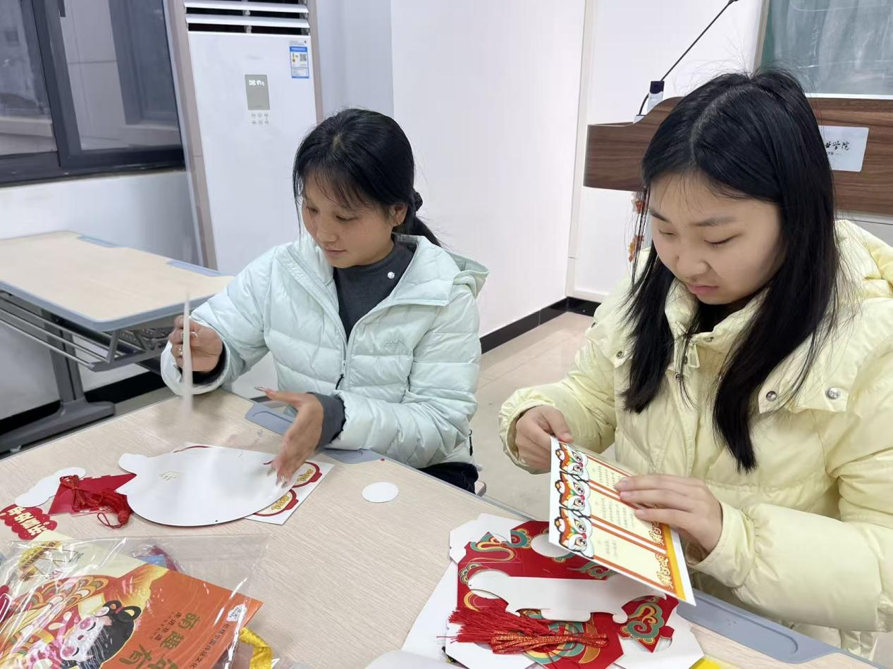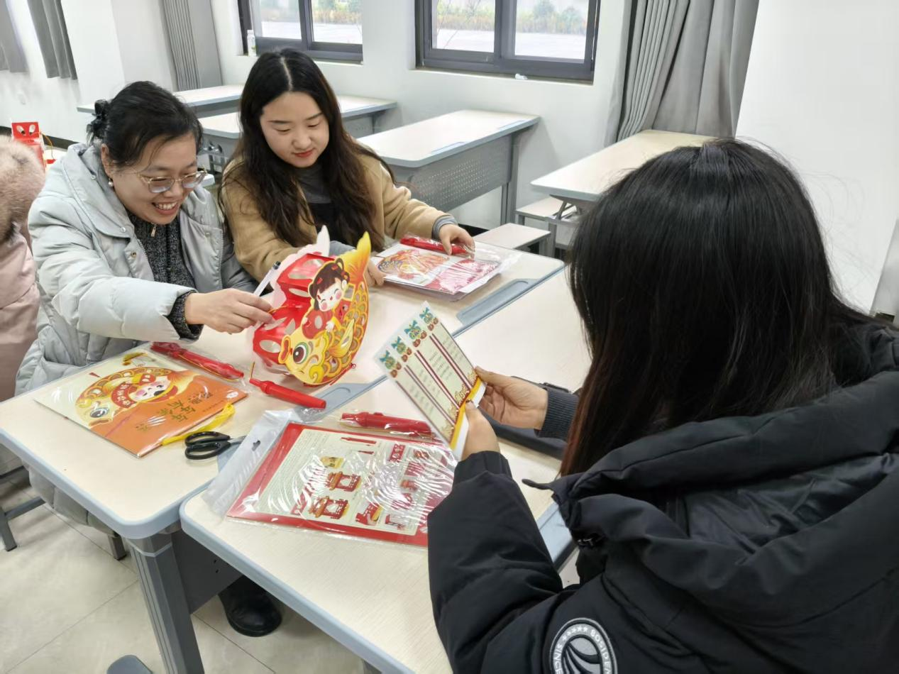 活动现场热闹非凡,五颜六色的彩纸、灯笼骨架、流苏穗子整齐摆放,等待着大家巧手生辉。老师们也兴致勃勃地加入其中,与同学们围坐在一起,或低头认真裁剪,或互相帮忙粘贴,不时传来阵阵笑声。有的老师手法娴熟,三两下就扎好灯笼骨架,引得同学们纷纷围观学习;有的同学别出心裁,在灯笼上画下可爱的图案,写上新年愿望,寄托美好期许。大家互相切磋、彼此指导,一盏盏虽不繁复却充满心意的灯笼渐渐成形,点亮了教室,也点亮了每个人的笑脸。光影摇曳间,师生共同欣赏作品,拍照留念,现场洋溢着浓浓的节日气息和温暖的师生情谊。