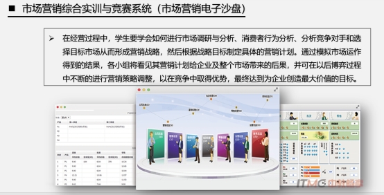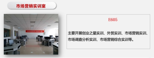 拥有河南省示范性实训基地(工商管理),有市场营销实训室、电子沙盘实训室、电子沙盘仿真实训室。实训基地主要面向市场营销等专业,帮助学生建立企业整体认识,熟悉企业岗位分工与职责,了解企业经营管理流程与基础管理决策等方法的综合企业经营模拟实训,集企业战略、财务、生产、营销等一体系统和模块,是集教学、培训、职业技能鉴定和技术服务为一体的专业化、多功能化实训基地。