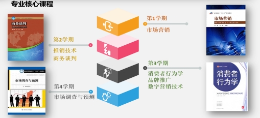 具有市场营销、品牌推广、销售管理、消费者行为学、数字营销技术、推销技术、商务谈判、市场调查与预测等专业核心课程,以及管理学、市场营销技能训练、广告学、营销策划、房地产营销、汽车营销、中国商贸文化、商务礼仪、经济学基础、经济法等一般专业课程。
