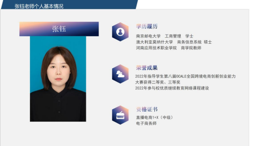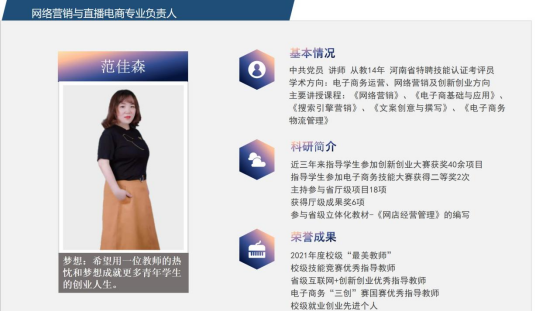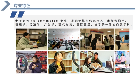 电子商务专业成立于2004年,学校综合改革试点专业。拥有河南省电子商务职业教育实训基地和河南省电子商务生产性实训基地;网店运营实训中心、新媒体运营实训中心、商务数据分析实训中心、商品采编实训中心、跨境电商实训中心;网店运营推广1+X证书试点单位、考核站点;直播电商1+X证书试点单位、考核站点;跨境电商B2B数据运营1+X证书试点单位、考核站点。