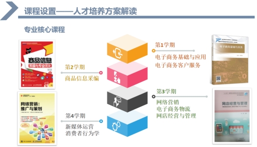 具有电子商务基础与应用、商品信息采编、网络营销、新媒体运营、电子商务客户服务、网店经营与管理、电子商务与物流、消费者行为学等核心课程,以及电子商务技能训练、电子商务视觉设计、跨境电子商务基础、电子商务法律法规、管理学、市场营销、企业实践、商务数据分析与应用、商务礼仪、中国商贸文化、经济学基础、国际贸易实务等一般专业课程。