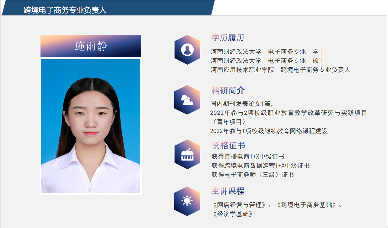 目前跨境电商专业教师是一支充满活力与创新精神的团队。与此同时,老师们也在不断的学习、培训,及时更新知识技能,以便向学生传授行业最新的知识、技能。