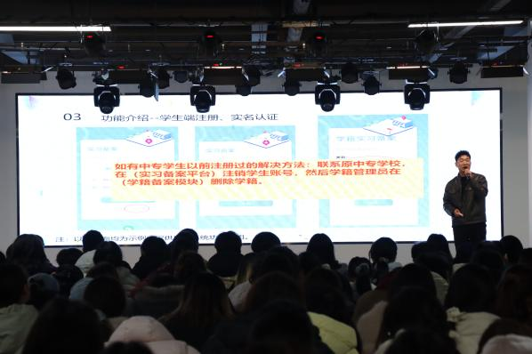 大会主体环节结束后,学院开展专项指导培训,岗位实习专员孙瑞杰讲解职校家园平台使用规范,明确实习报备、日志填写等操作要求;就业专员吴淼对就业平台使用及信息填报进行培训,助力学生掌握相关技能。