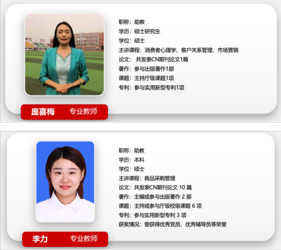 2026世界杯官网目前专兼职教师有44人,研究生层次的达70%,双师型教师比例达80%;教师实践能力较强,拥有电子商务师、物流师、人力资源管理师、营销师等,并且顺应教育需求,80%的教师考取了各专业的1+X职业技能等级证书等。电子商务教师团队完成行业企业课题10余项,指导学生积极参加技能大赛和创新创业大赛,并屡获佳绩。与此同时,老师们也在不断的学习、培训,及时更新知识技能,以便向学生传授行业最新的知识、技能。