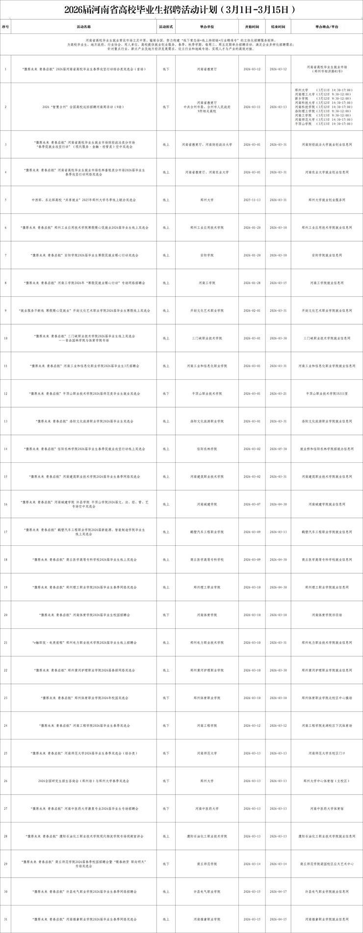为深入贯彻党中央、国务院和省委、省政府关于做好高校毕业生就业工作决策部署,推进实施“2026届河南省高校毕业生就业扩容提质行动”,全省教育系统抢抓春季促就业关键期,组织开展一系列招聘活动,推动行业人才供需精准对接,促进2026届高校毕业生充分就业。
