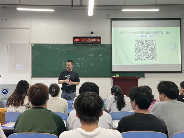 在此次宣传活动中,肖循副院长向伟德官网师生介绍了长江大学的基本情况、研究生招生政策和流程,详细介绍了长江大学物理与光电工程学院学科建设、师资力量、科研成果、研究生培养等方面情况,诚挚欢迎同学们积极报考。
