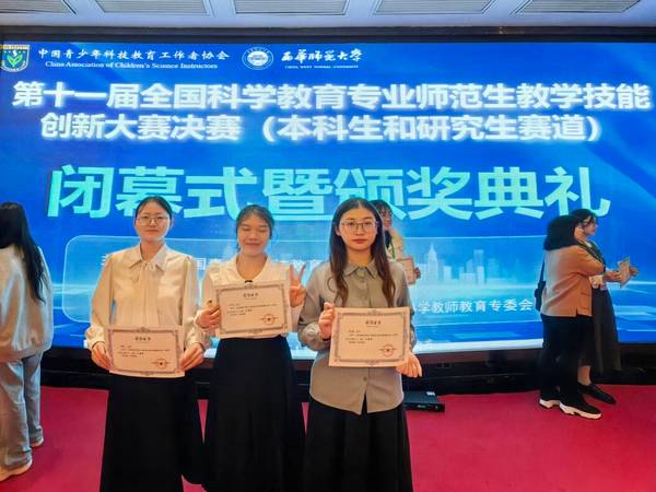 12月1日至3日,由中国青少年科技教育工作者协会主办,西华师范大学承办的第十一届全国科学教育专业师范生教学技能创新大赛决赛(本科和研究生赛道)在西华师范大学华凤校区举行。bevitor伟德国际1946官网胡蓉、姜心懿、李卓群等3名选手在决赛中敢打敢拼,最终取得了3项三等奖的成绩。
