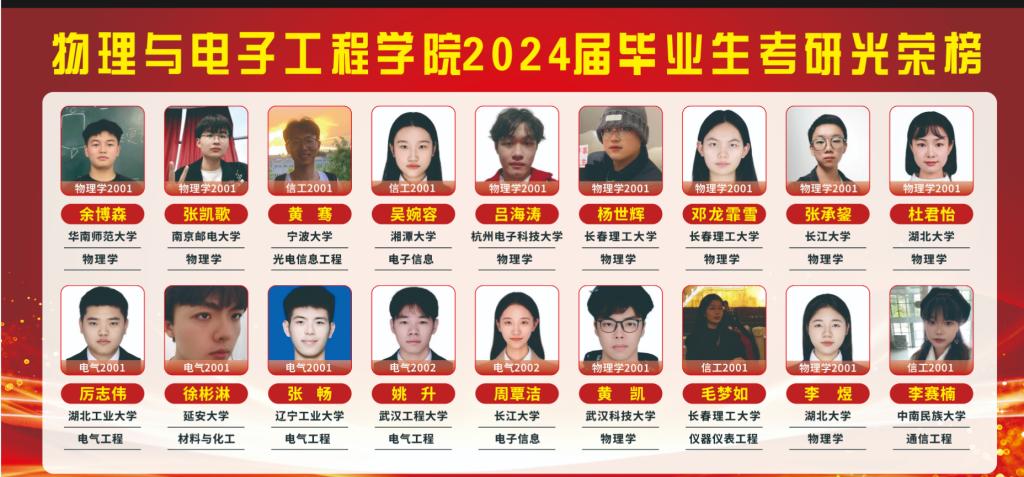 考研捷报频传,伟德官网学子再展风采。随着2024年全国硕士研究生招生录取工作的圆满结束,学院2024届毕业生共有18人成功被录取,另有1人成功被国外高校录取。据统计,伟德官网2024届共有184名毕业生,报考54人,录取率高达10.6%,报录率为33.3%,录取高校不乏华南师范大学、南京邮电大学、宁波大学、湘潭大学等“双一流”高校。其中,在录取学生中,物理学专业毕业生占比47.3%,也彰显了学院物理学专业人才培养成效显著。