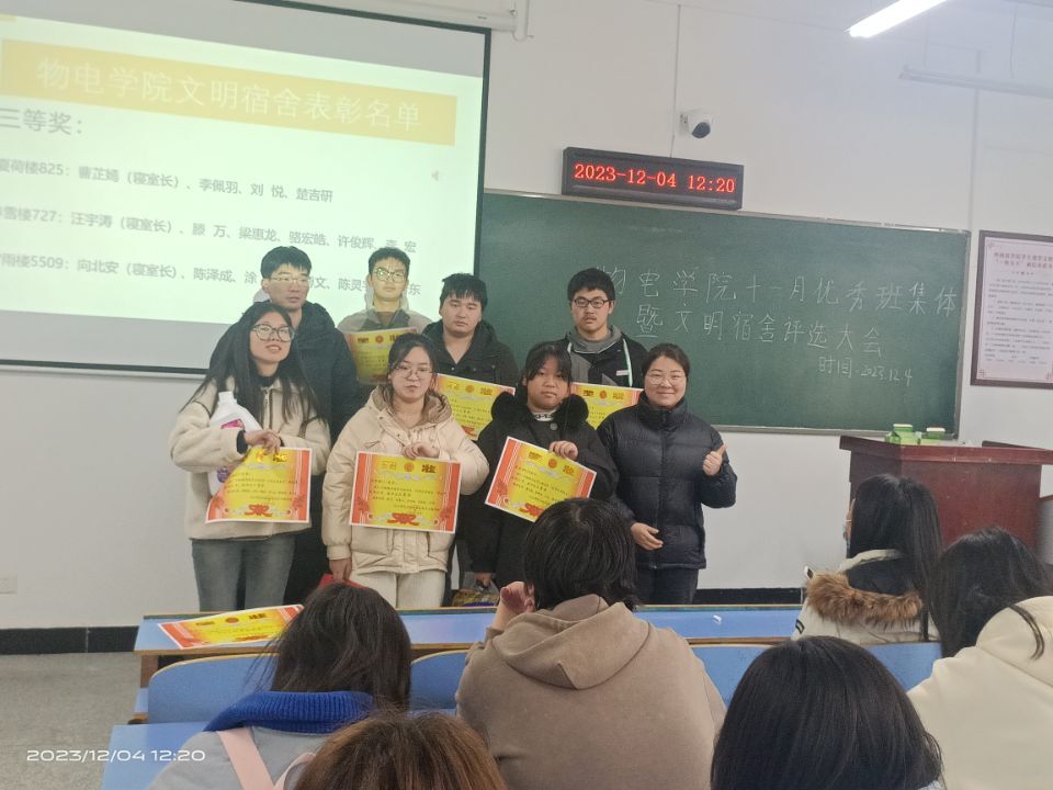 会议伊始,院分党委副书记戴俊强调了良好的班风和学风对同学成长的重要意义,要求广大同学以“四个文明”创建为契机,向先进看齐,持之以恒加强优良学风和班风建设。随后,自律委员会、学生会相关负责人详细讲解了评选标准和程序。最终,时雨楼412、时雨楼413、时雨楼5515、时雨楼5509、夏荷楼825、春雪楼727获得11月份“文明宿舍”称号,物理学2302班、电气工程2201班获得11月份“优秀班集体”荣誉称号,与会的老师为先进集体颁发了奖状和奖品。