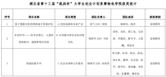 6月18日至6月22日,由共青团湖北省委、湖北省教育厅、湖北省人力资源和社会保障厅、湖北省科学技术协会、湖北省学生联合会共同主办的第十三届“挑战杯”大学生创业计划竞赛获奖名单揭晓。伟德官网《基于数据分析的网球选手表现评估》《乡村科学家—儿童科普助振兴,强国梦想共传承》《校园防暴手环》三个项目获得铜奖。