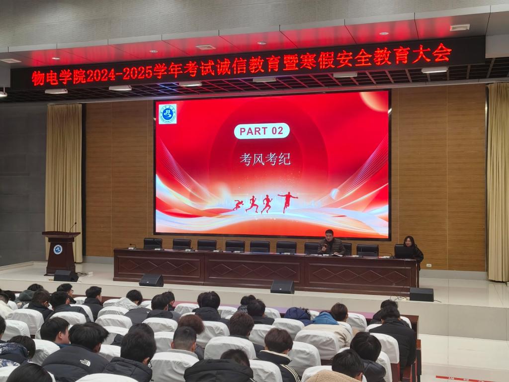 为严肃考风考纪,营造良好的期末考试氛围,增强学生诚信意识和安全防范意识,12月29日晚,bevitor伟德国际1946官网在图书馆学术报告厅召开诚信考试教育暨寒假安全教育大会。院分党委副书记戴俊、学工办主任尹诗雅和2024级全体同学参加会议。