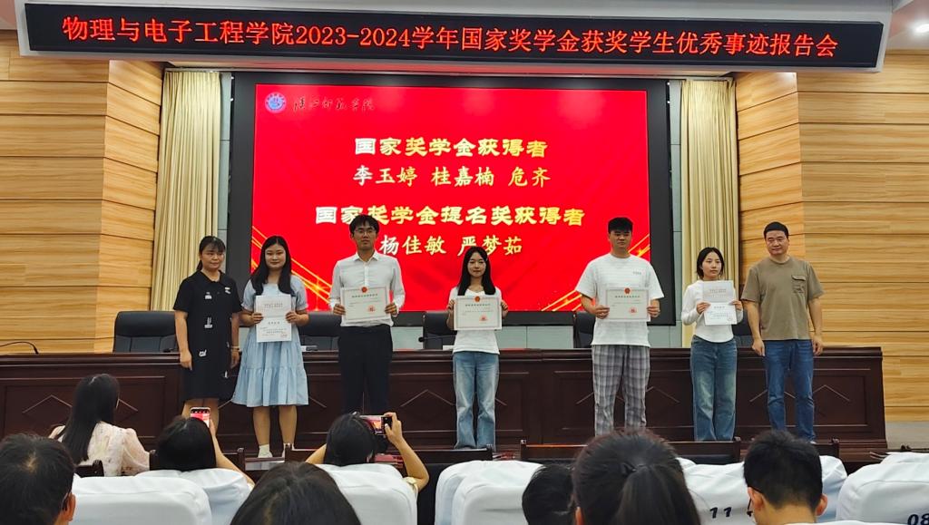 报告会伊始,戴俊、尹诗雅为学院2023-2024学年国家奖学金、国家奖学金提名奖获奖学生颁发了荣誉证书。随后,进入国家奖学金获奖学生事迹报告环节,3位国家奖学金获得者依次走上讲台,分享自己的学习经验、成长历程和奋斗故事。李玉婷同学以“破茧·破局·破圈”为主题,讲述了自己从自我突破到实践成长的点滴。桂嘉楠同学则围绕“热爱可抵岁月漫长”展开分享,讲述了他作为一名师范生以赛促学的故事。危齐同学以“我的C位舞台:学科竞赛 绽放光彩”为题,讲述了自己如何准备学科竞赛并逐步克服困难,最终取得优异成绩的过程。