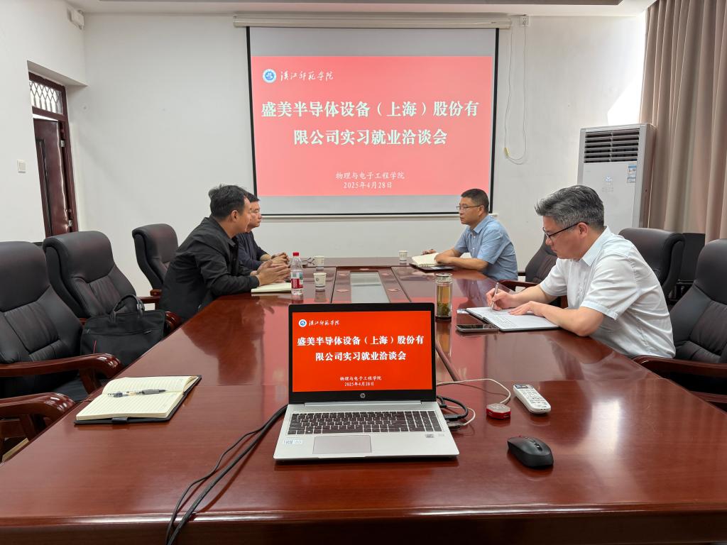 4月28日上午,盛美半导体设备(上海)股份有限公司到访伟德官网,就实习就业相关工作进行洽谈。学院分党委书记唐传球、副院长刘锋、副书记戴俊和辅导员贺培参加会议。