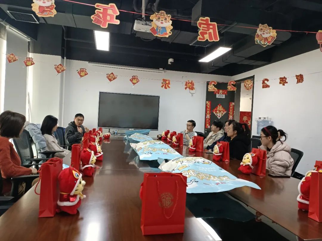 学院精心布置了活动现场,会议室门口挂起了春联,“2022新年快乐”的拉旗、“虎年大吉”和“万事如意”的纸折扇使现场年味浓浓,气氛温馨。