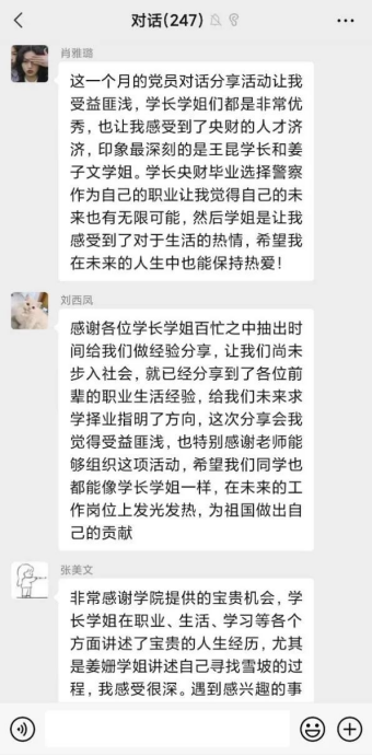 122cc太阳集成游戏官方网站党委特邀请了李响、朱炬兵、孙建华、姜姗、张川石、姜子文、张银、王昆、王朝阳、田燕刚等十位工作在各行各业的基层党员校友和嘉宾。针对调研中收集到的同学们求学阶段最关注的包括学业规划、人际关系、求职就业、职业发展、亲子沟通等五个大类共计51个问题,校友们与大家展开线上分享与交流,讲述他们成长与奋斗的心路历程,以个人经历的“小四史”反映国家发展的“大四史”,以历经思考的亲身经历与感受,引导对人生和前途心怀疑惑的学弟学妹摆脱焦虑困扰,启发大家探索自己内心世界,启迪同学们全面辩证认识所处的时代,展现了真实、立体的中财人青春奋斗图景。122cc太阳集成游戏官方网站党委书记郭冬梅老师鼓励大家学史明理、学史增信、学史崇德、学史力行,与时代同步伐、与人民共命运,切实做到不忘初心、脚踏实地、忠诚奋进!